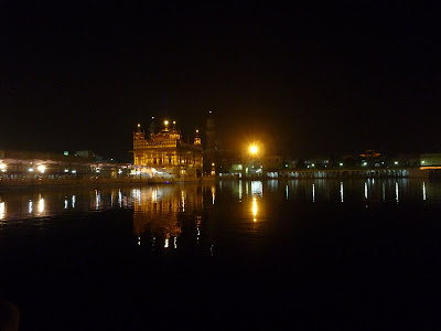 デリーから北に約500kmのところにある アムリットサルという街に行ってきました。 ここはシーク教の聖地、黄金寺院があることで有名なところです。 この寺院は聖地にもかかわらず一般客も快く入れてくれます。 ただし、シーク教徒が頭にターバンを巻くように 何かで頭を覆う必要があります。 あと、この寺院の隣には巡礼宿があり 外国人も無料で受け入れてくれます。 ご好意に甘えて一泊してまいりました。 夜の黄金寺院はたいそうキレイでした。